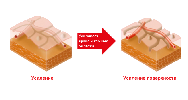 Усиление поверхности (SE) — режим усиливает контраст между светлыми и темными участками за счёт получения данных интенсивности яркости для каждого пикселя и усиливаются краевые компоненты. При обычном усилении мелкие изменения структур воспринимаются как шум, а область с такими изменениями сглаживается. В режиме усиления поверхности более четко визуализируются края, соответствующие мелким изменениям в структуре. С режимом SE гораздо легче визуализировать края анатомического образования, лучше очертить слизистые структуры и складки тканей, приподнимая структуры и подчёркивая кровеносные сосуды.
