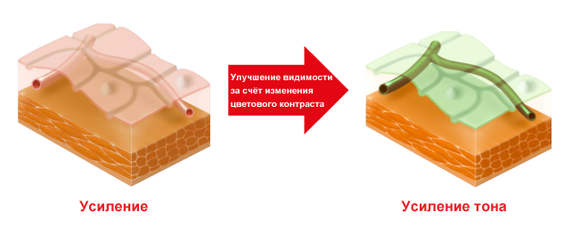 Усиление тона (TE) — при включении режима выделяются и анализируются отдельные красно-зелено-синие (RBG) компоненты нормального изображения, изменяются цветовые частоты и получается новое изображение без заметной для исследователя задержки. Режим усиления тона подчёркивает мелкие структуры слизистой, характер слизистой и сосудистых структур для облегчения описания поражения. Режим TE используется в шести случаях/вариантах:
