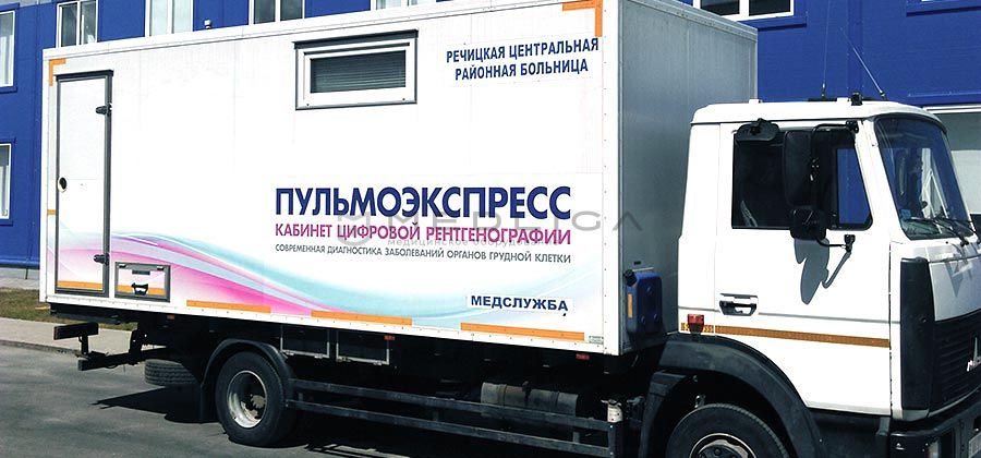 Кабинет рентгеновский перевозимый ПУЛЬМОЭКСПРЕСС для цифровой рентгенографии органов грудной клетки. В комплексе расположен низкодозный флюорограф ПУЛЬМОСКАН