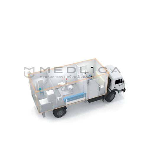 К процедурной примыкает бытовая комната и туалетная комната для персонала. В бытовой комнате находится гардероб для персонала и холодильник, ниже устанавливается дизельная мини-электростанция, что дает возможность проводить обследования вдали от электрических сетей.
