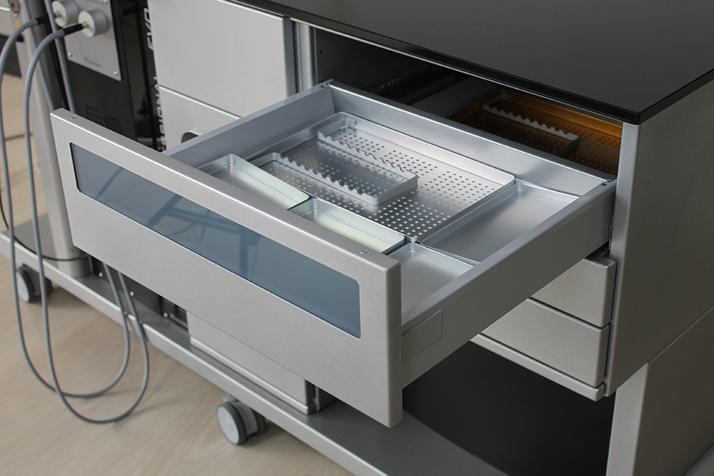- Удобное хранение инструментария. Комбайн имеет 4 ящика для хранения инструментария, которые выдвигаются автоматически при нажатии, что позволяет врачу открывать ящик, не снимая стерильные перчатки. Все ящики оснащены металлическими лотками (автоклавируемыми) для инструментов. В верхнем ящике для поддержания стерильности инструментария установлена бактерицидная УФ-лампа;