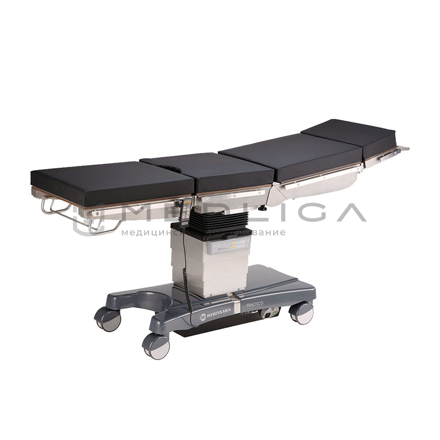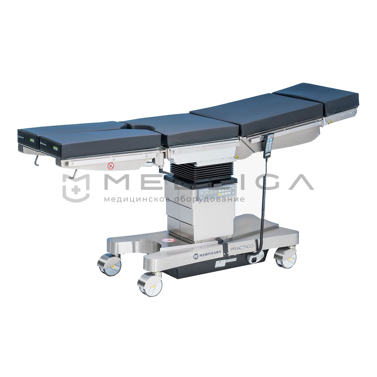 Merivaara Practico – универсальный регулируемый мобильный электромеханический операционный стол для общей и специализированной хирургии. Использование дополнительных приспособлений делает стол узкоспециализированным для выполнения широкого спектра хирургических операций.